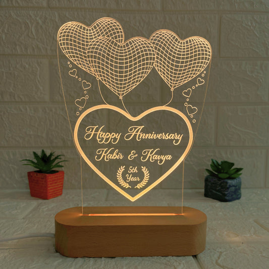Nexify Fusion Personalised 3D Illusion Happy Anniversary LED Lamp with Couple Names & Year | 3Heart Design Night Lamp with Wooden Base | Unique Gift for Anniversary | Multicolor (DNFHEA8M)