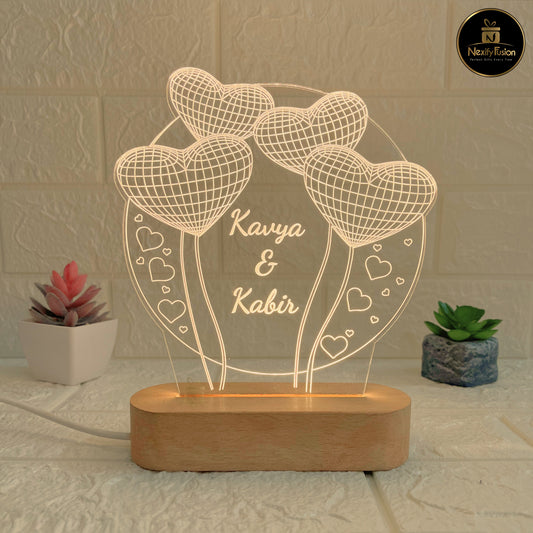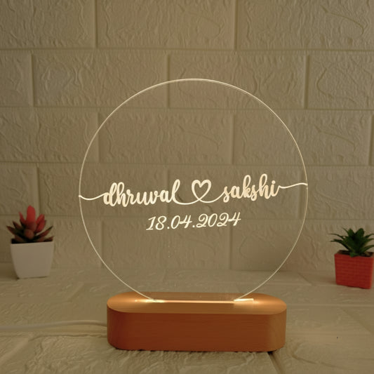 Personalised 3D Illusion Couple Name LED Acrylic Lamp with Wooden Base | Romantic Decorative Night Light for Anniversary, Valentine’s Day, or Wedding Gift (DNFICO9)