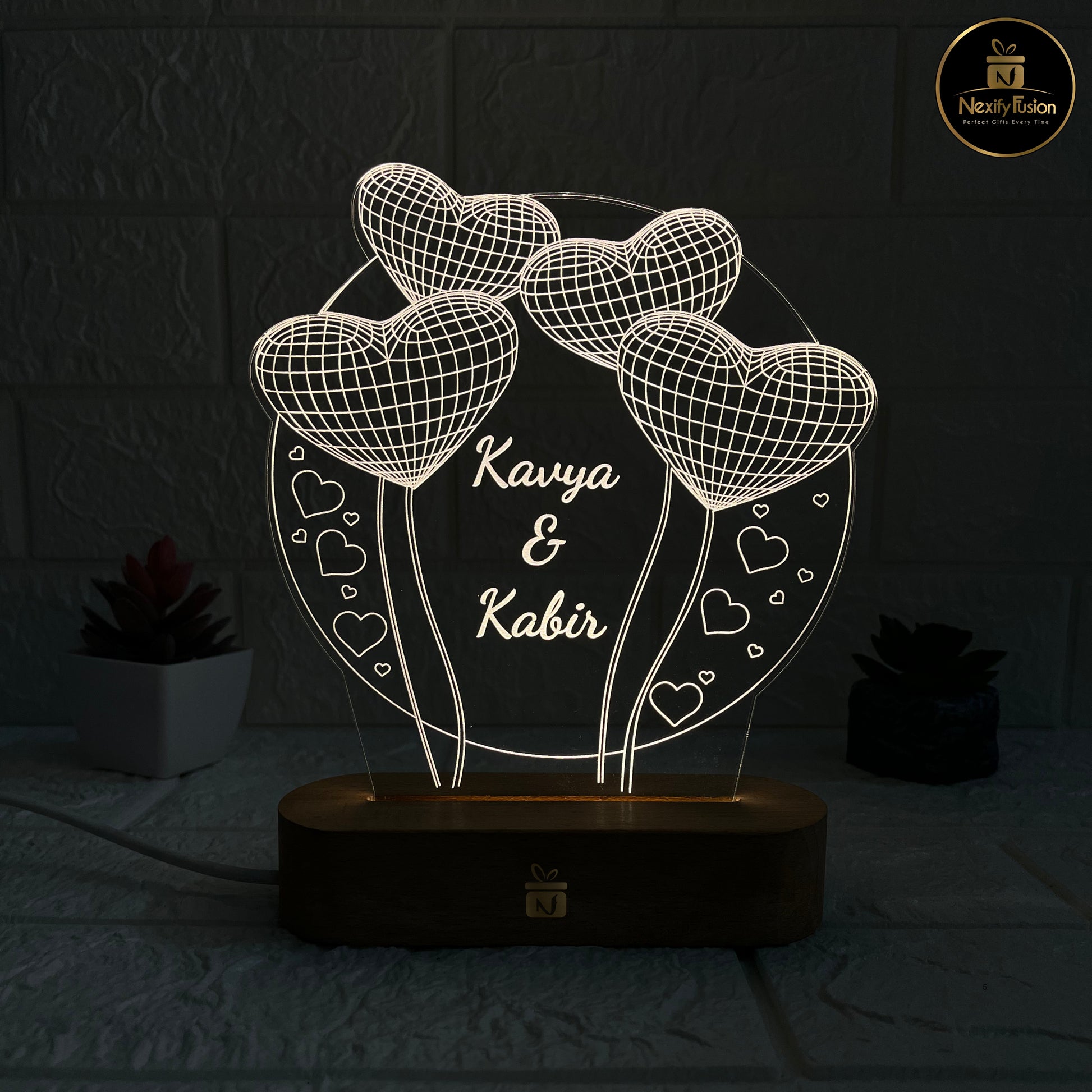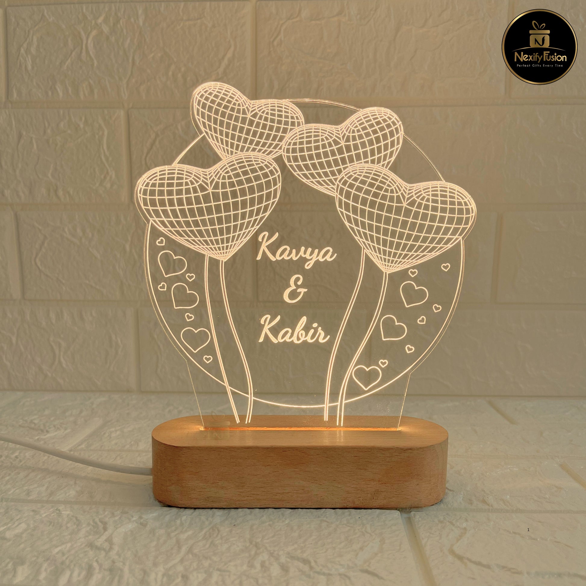 Celebrate love and togetherness with the Nexify Fusion Personalised 3D Illusion Round 3 Heart Design Night Lamp – a unique way to preserve memories and emotions in light. This elegant lamp features a Round Frame with Three Hearts, symbolising deep connection, unity, and everlasting love. The lamp can be personalised with Couple Names and a Special Date, making it a timeless keepsake for anniversaries, weddings, engagements, Valentine’s Day, or birthdays. Its soft LED glow creates a warm and romantic ambience, perfect for bedrooms, side tables, or living rooms. Crafted with precision using laser-engraved acrylic and a sturdy wooden base, the lamp is durable, stylish, and long-lasting. With convenient USB power support, it can be easily used with laptops, power banks, or adapters. More than just a lamp, this is a personalised décor piece and a unique romantic gift that will brighten both spaces and hearts. At Nexify Fusion, we believe gifts should be as meaningful as the moments they represent.