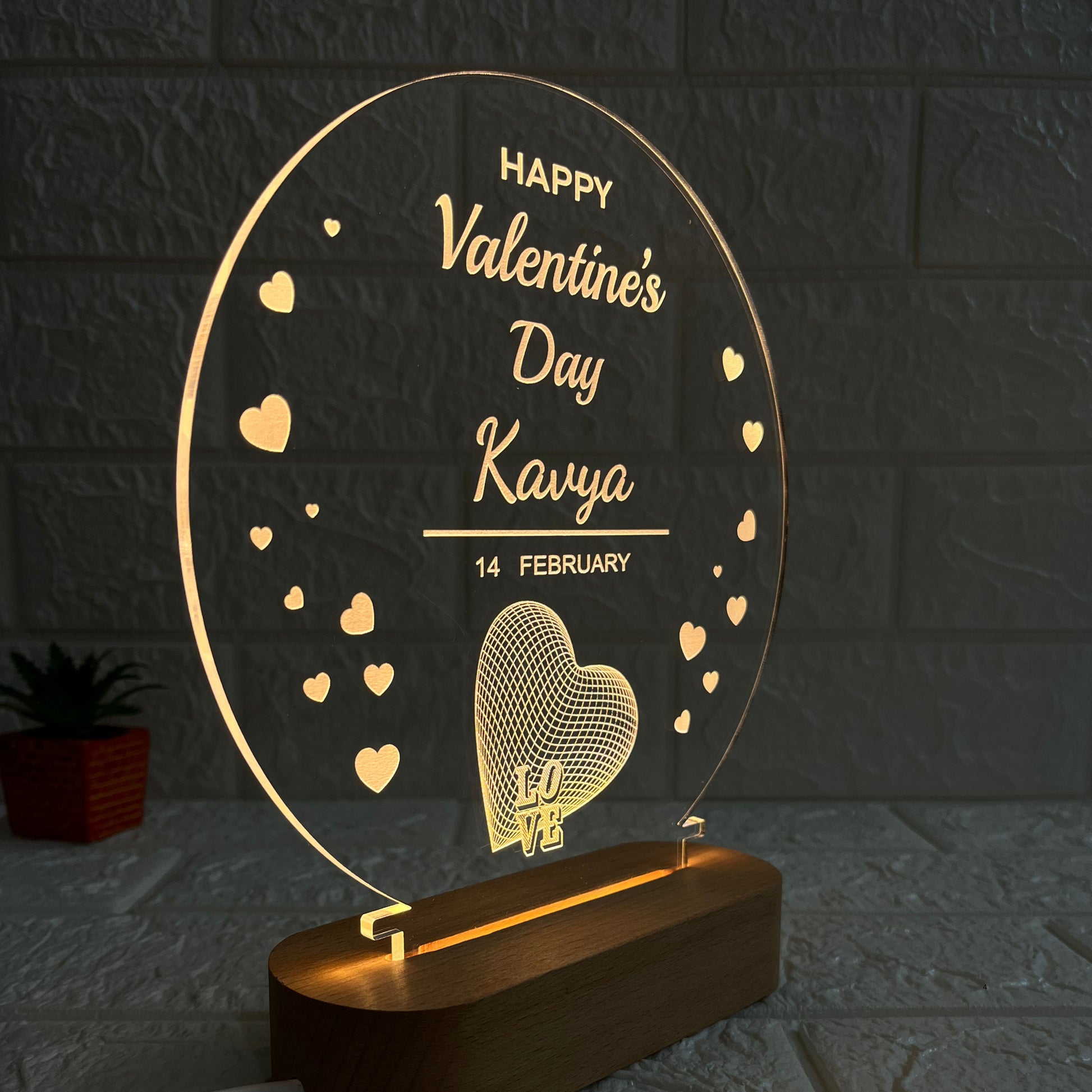 Celebrate the beauty of love this Valentine’s Day with a glowing symbol of affection. This elegant LED acrylic lamp captures the essence of romance with its warm white light, intricate round design, and your loved one’s name beautifully engraved — making it the perfect expression of how deeply you cherish your bond. Crafted with precision on crystal-clear acrylic and a smooth wooden base, it transforms any corner into a space filled with love and serenity. Whether as a Valentine’s surprise or a timeless keepsake, this lamp radiates the same gentle, pure, and heartfelt glow that your relationship brings to life.