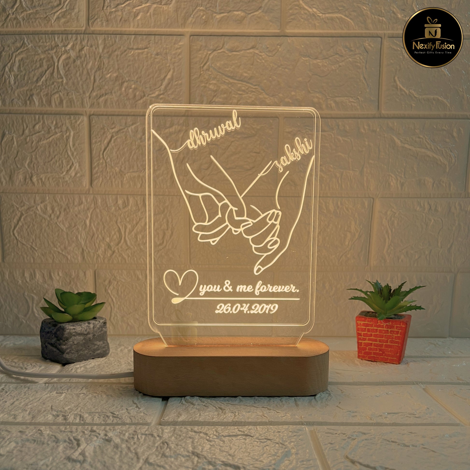 Light up your special moments with this Personalized Hands LED Acrylic Lamp, a timeless keepsake designed to celebrate love. Customized with your names, date, or message, it transforms into a glowing reminder of your most meaningful memories.